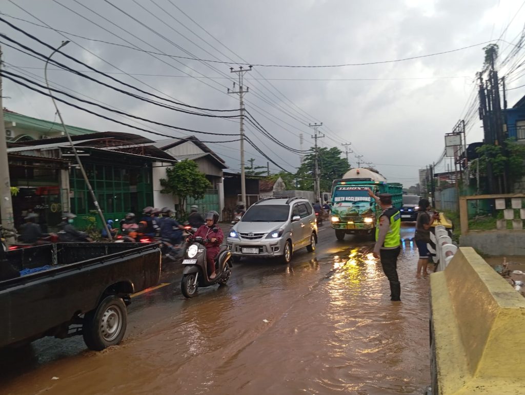 Banjir terjadi karena meningkatnya intensitas hujan yang menyebabkan debit air sungai naik dan meluap ke badan jalan.