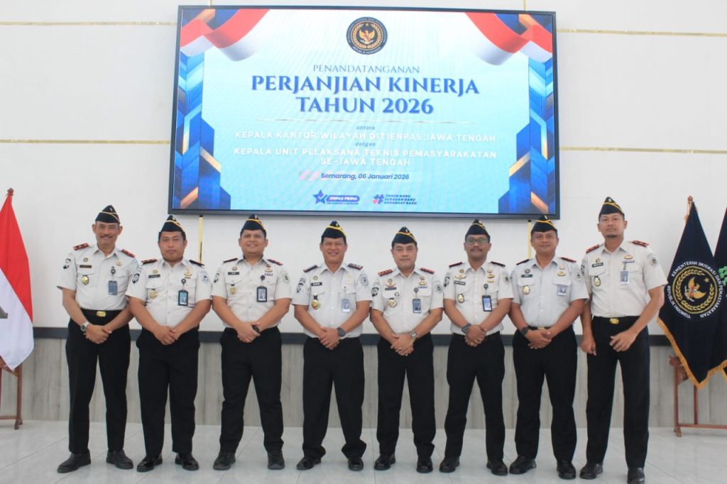 Penandatanganan Perjanjian Kinerja tersebut merupakan langkah strategis dalam menyelaraskan program kerja dan target kinerja di lingkungan pemasyarakatan Jawa Tengah untuk Tahun 2026. Dalam kesempatan tersebut, Kakanwil Ditjenpas Jawa Tengah menegaskan pentingnya integritas, sinergi, dan inovasi seluruh jajaran pemasyarakatan guna mendukung pelaksanaan tugas dan fungsi pemasyarakatan secara optimal.